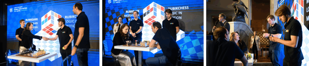 Before the tournament, the new format was introduced with a festive showcase on the Morgan Stanley stage: Judit Polgar and Péter Lizák played on the chessboard, while Kolos Kántor and Krisztián Fazakas solved Rubik’s Cubes, demonstrating the unique fusion of chess and the cube.